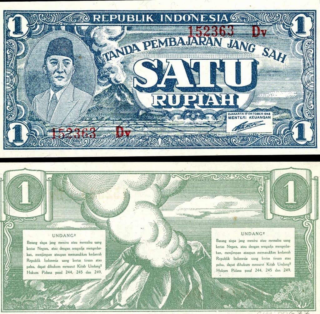 La République d’Indonésie a émis ce billet de 1 Rupiah en 1949, au cours des années turbulentes qui ont suivi l’indépendance du pays vis-à-vis des Néerlandais. Après la reconnaissance formelle de la République, ces premiers billets ont été remplacés par une nouvelle monnaie, ce qui les rend rares. La valeur marchande d’un exemplaire bien conservé de ce billet se situe généralement entre 500 $ et 2 000 $.