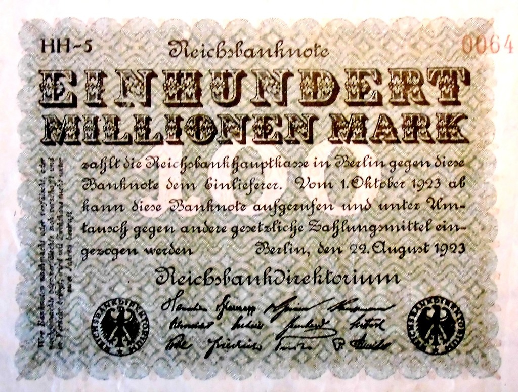Lors de la crise d’hyperinflation en Allemagne au début des années 1920, le gouvernement a émis des coupures massives de papier-monnaie, dont le billet de 100 000 000 mark en 1923. Cette monnaie a été utilisée lors de l’effondrement économique de la République de Weimar, qui a conduit à la dévaluation du mark allemand. En raison du grand nombre de billets imprimés et de l’inflation rapide, très peu de ces billets restent en bon état aujourd’hui. Ils sont actuellement évalués entre 400 $ et 1 500 $, selon leur état.