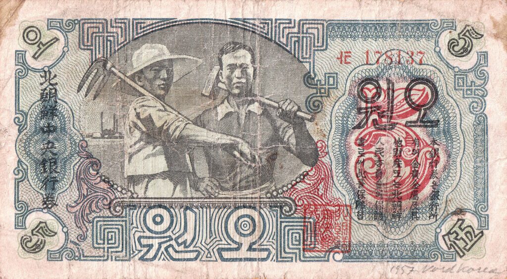 Au lendemain de la Seconde Guerre mondiale, la République de Corée a émis le billet de 5 won en 1947 dans le cadre de la réforme monétaire consécutive à l’occupation japonaise. Ce billet est rare car la monnaie a été rapidement remplacée par de nouvelles coupures après le début de la guerre de Corée. La valeur actuelle de ce billet est estimée entre 600 $ et 1 500 $, selon l’état et l’exhaustivité de la facture.