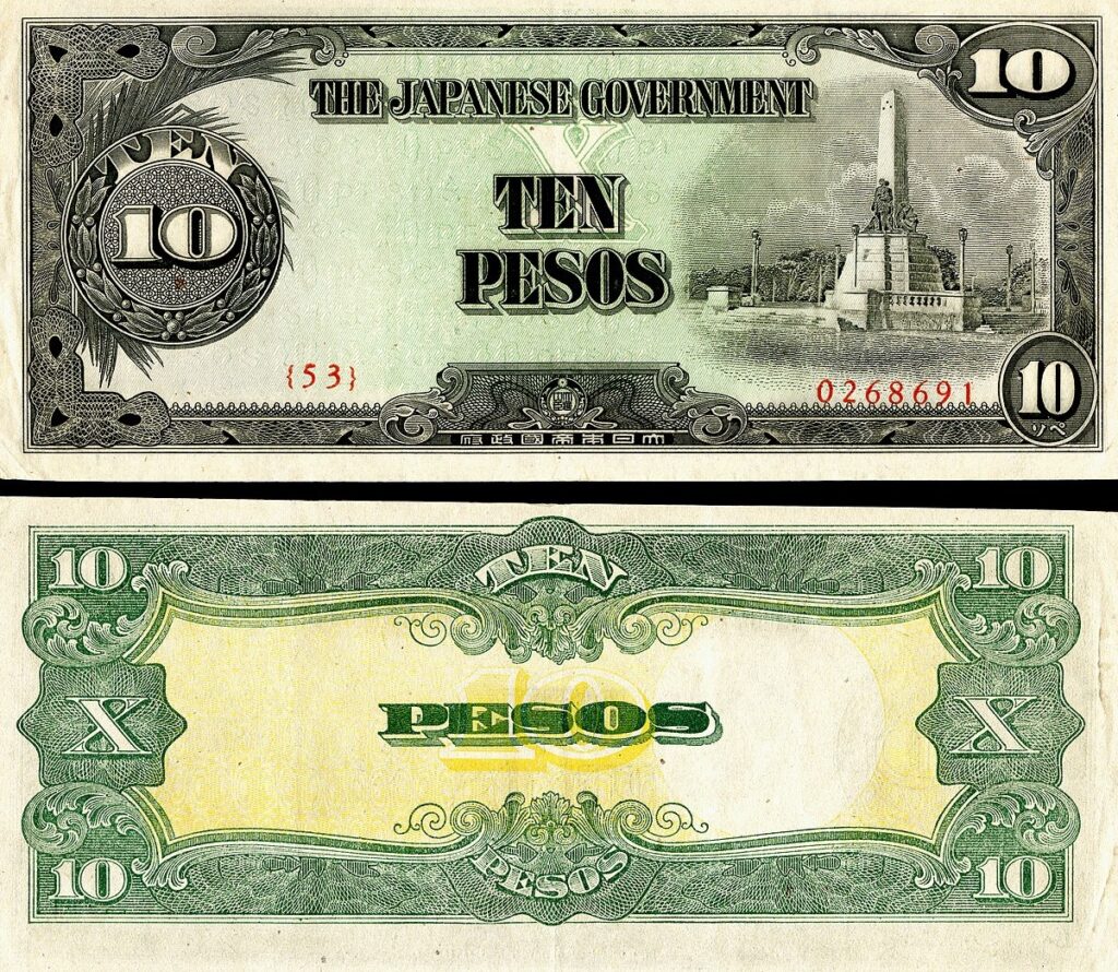 Pendant l’occupation japonaise des Philippines pendant la Seconde Guerre mondiale, les Japonais ont émis une série de papier-monnaie, dont le billet de 10 pesos. Les Philippines ont été sous domination japonaise de 1942 à 1945 et les billets ont été rapidement dévalués après la libération du pays. En raison de la courte période pendant laquelle ces billets ont été en circulation, ils sont aujourd’hui considérés comme très rares. La valeur marchande d’un exemplaire de haute qualité de cette facture se situe entre 500 $ et 2 000 $.