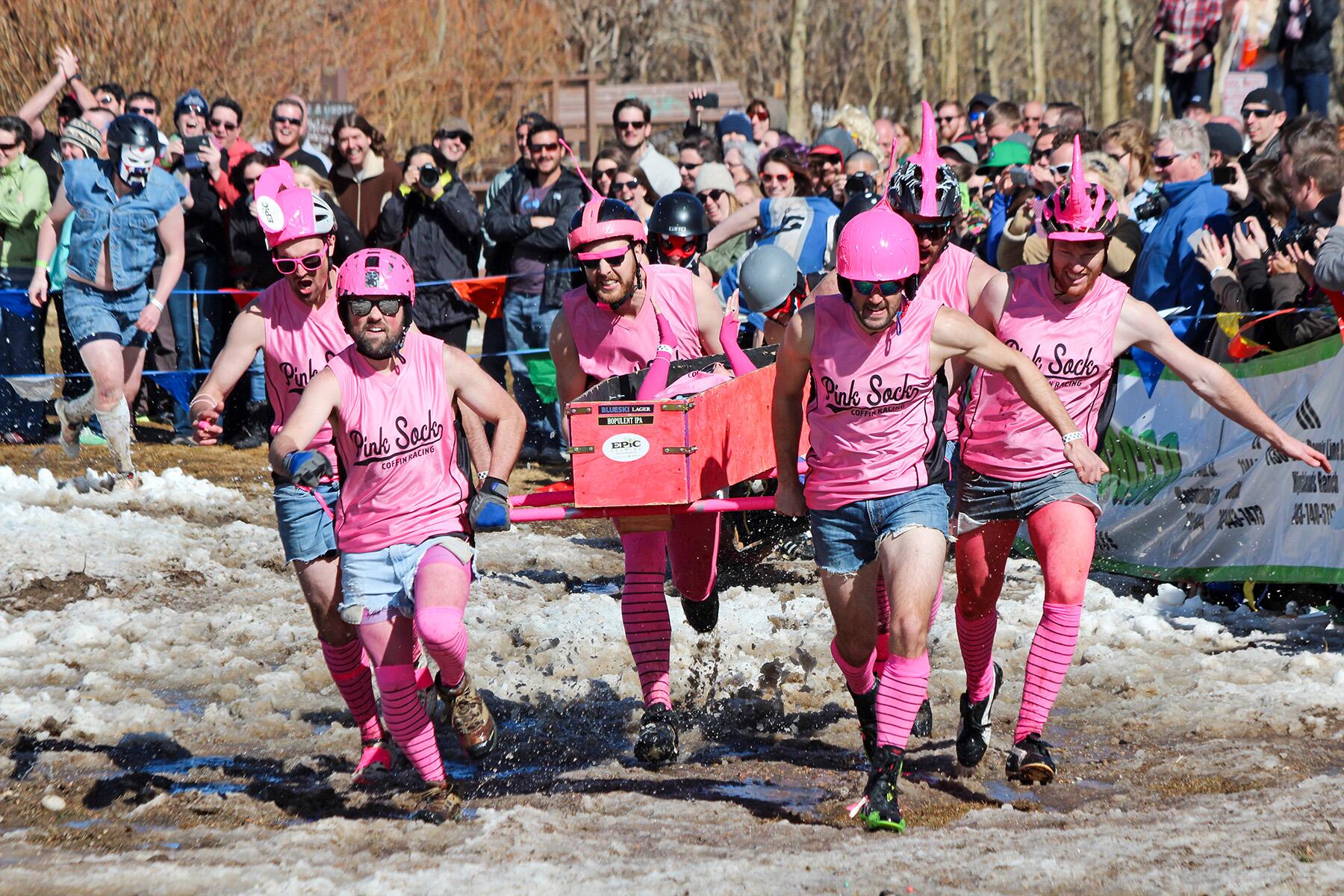 Le festival débute avec le « Crawl to the Ball », une tournée des bars animée qui culmine avec le Royal Blue Ball, une soirée dansante et costumée organisée à l’historique hôtel Stanley. Les costumes sont non seulement encouragés mais célébrés, ce qui en fait l’une des nuits les plus colorées du festival. L’événement principal comprend les fameuses courses de cercueils, où des équipes vêtues de costumes scandaleux courent à travers des parcours d’obstacles tout en transportant des « gars » (ou femmes) morts dans des cercueils. La course aux cercueils, clin d’œil évident à la célébrité figée de la ville, est l’un des événements les plus attendus année après année et constitue le type d’activité excentrique que vous ne trouverez pas dans d’autres festivals.