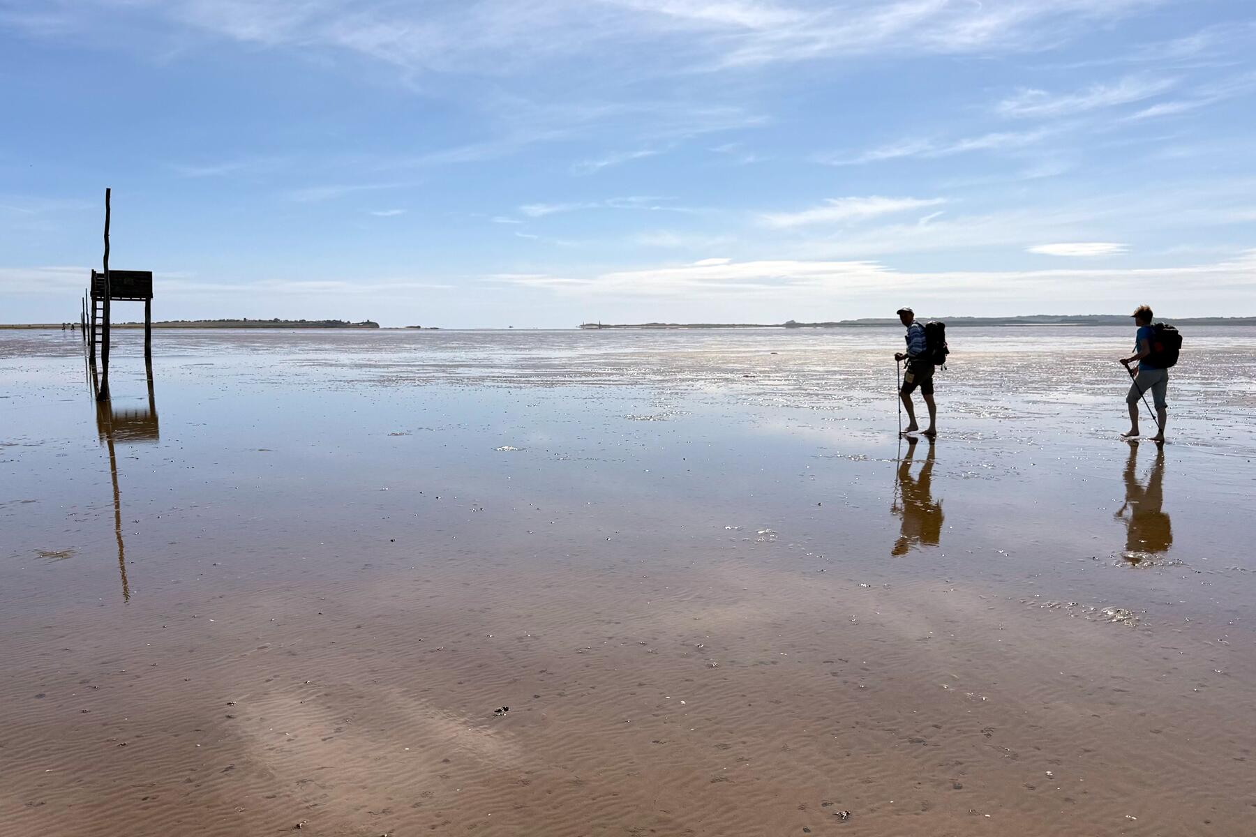 Deux fois par jour, à marée basse, l’île rejoint le continent. Des centaines de voitures traversent une chaussée construite dans les années 1950. Le reste d’entre nous suit l’ancien chemin de pèlerinage, tout comme le faisaient les moines, marchant trois miles (généralement pieds nus) à travers le limon et la boue pour atteindre l’île Sainte.